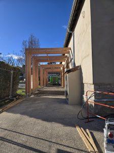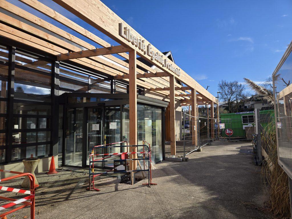 Une pergola a été créée le long des façades Ouest et Sud du bâtiment. Plus qu’un simple auvent, elle joue un rôle protecteur contre les intempéries, tout en filtrant la lumière naturelle pour les espaces intérieurs. Son impact se prolonge sur les parvis extérieurs, créant un abri fonctionnel et esthétique pour les usagers.