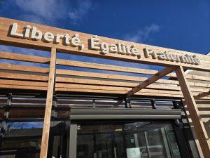 Avec ses poteaux aux rythmes irréguliers et aux sections variables, cette structure apporte une signature contemporaine à la façade. Elle sert également de support de signalétique, rendant l’entrée de la mairie clairement identifiable depuis l’espace public.